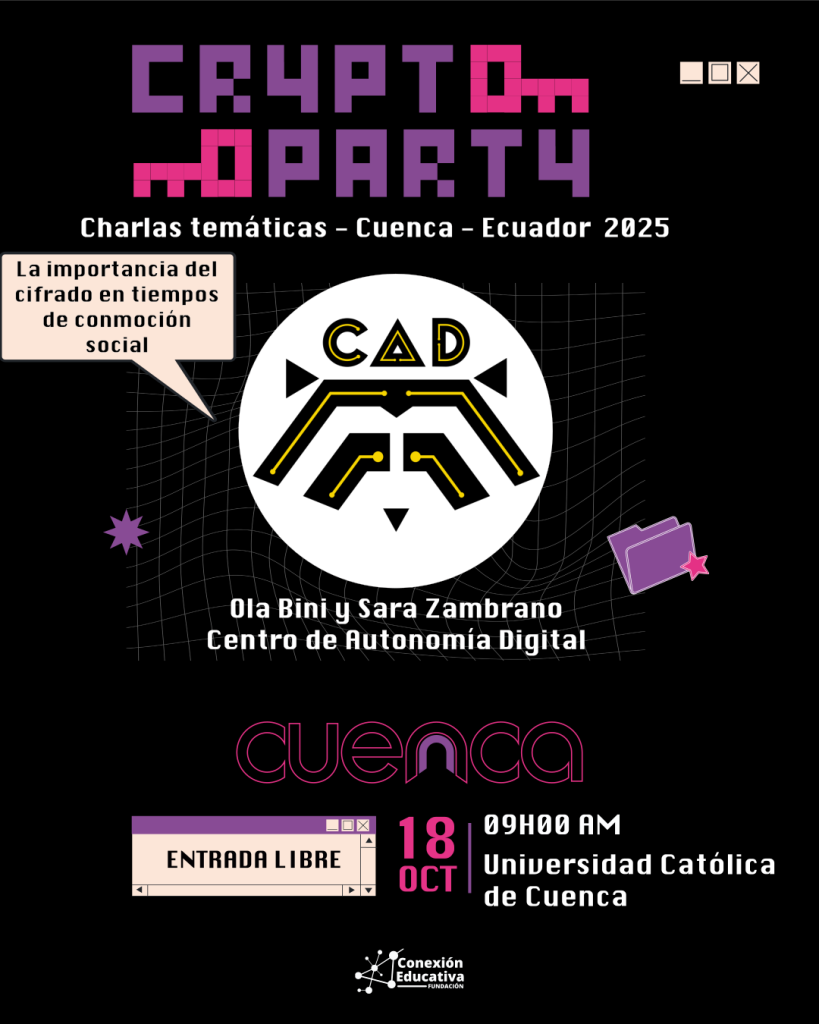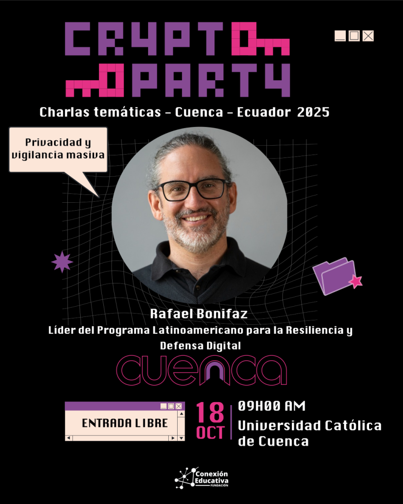 Fundación Conexión Educativa, como parte de la Coalición Global del Cifrado, organizó este año el CryptoParty, realizado en la ciudad de Cuenca, Ecuador.